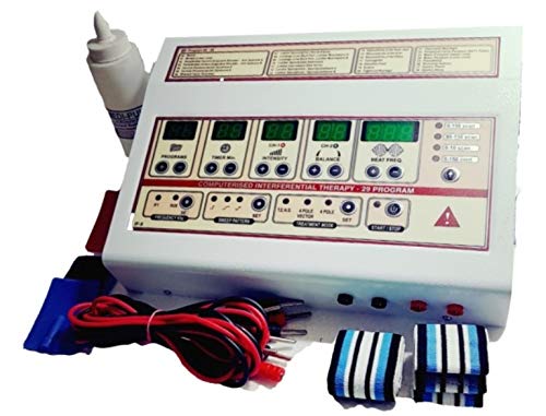 Programmed: 29 with digital Display Carrier Frequency: 2Khz, 4khz. Therapy Modes: 4P, 4PV, 2P, Acessories: 1pc Main cord, 4pcs wire, 4pcs Rubber Pads, Set of Strap,1 carry bag ,1 jel bottle One year warranty,made in india