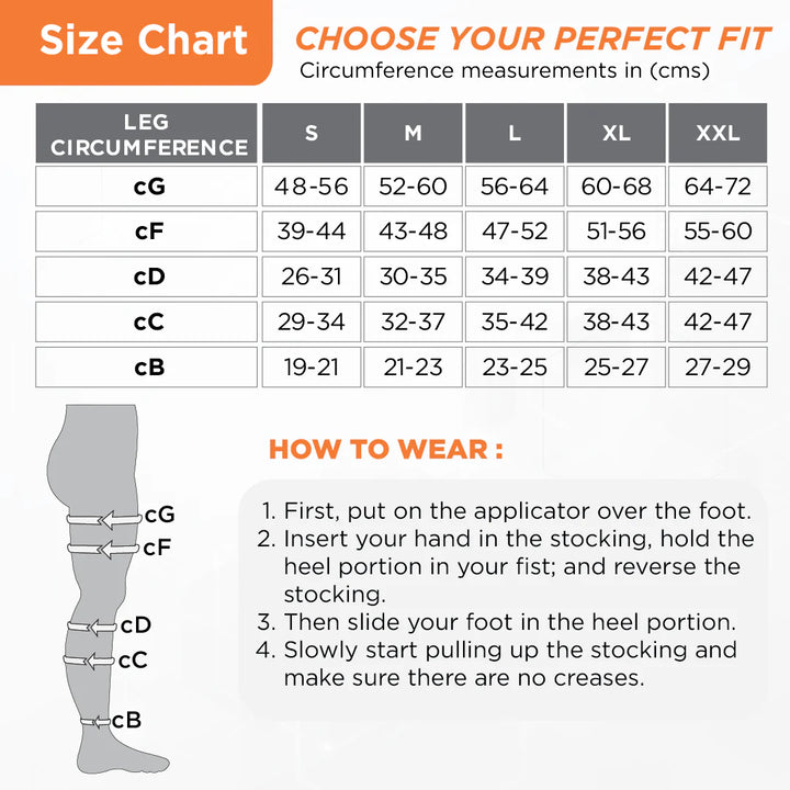 Putting them on is easy: first, use the applicator provided to slide the stocking up the leg. Insert your hand, align the heel pocket, then carefully pull the stocking up towards the knee, ensuring a smooth, crease-free fit.