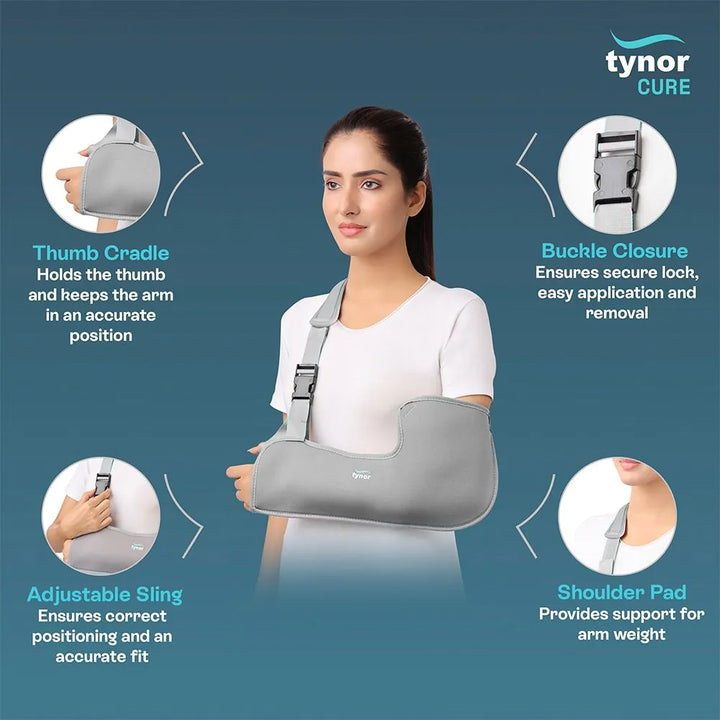 Durable fabric holds heavy casts easily Functional design covers and supports the cast optimally Thumb cradle holds the thumb and keeps the arm in an accurate position. Secure closures ensure easy application and removal. Adjustable sling ensures correct positioning and an accurate fit. Shoulder pad provides support for arm weight.